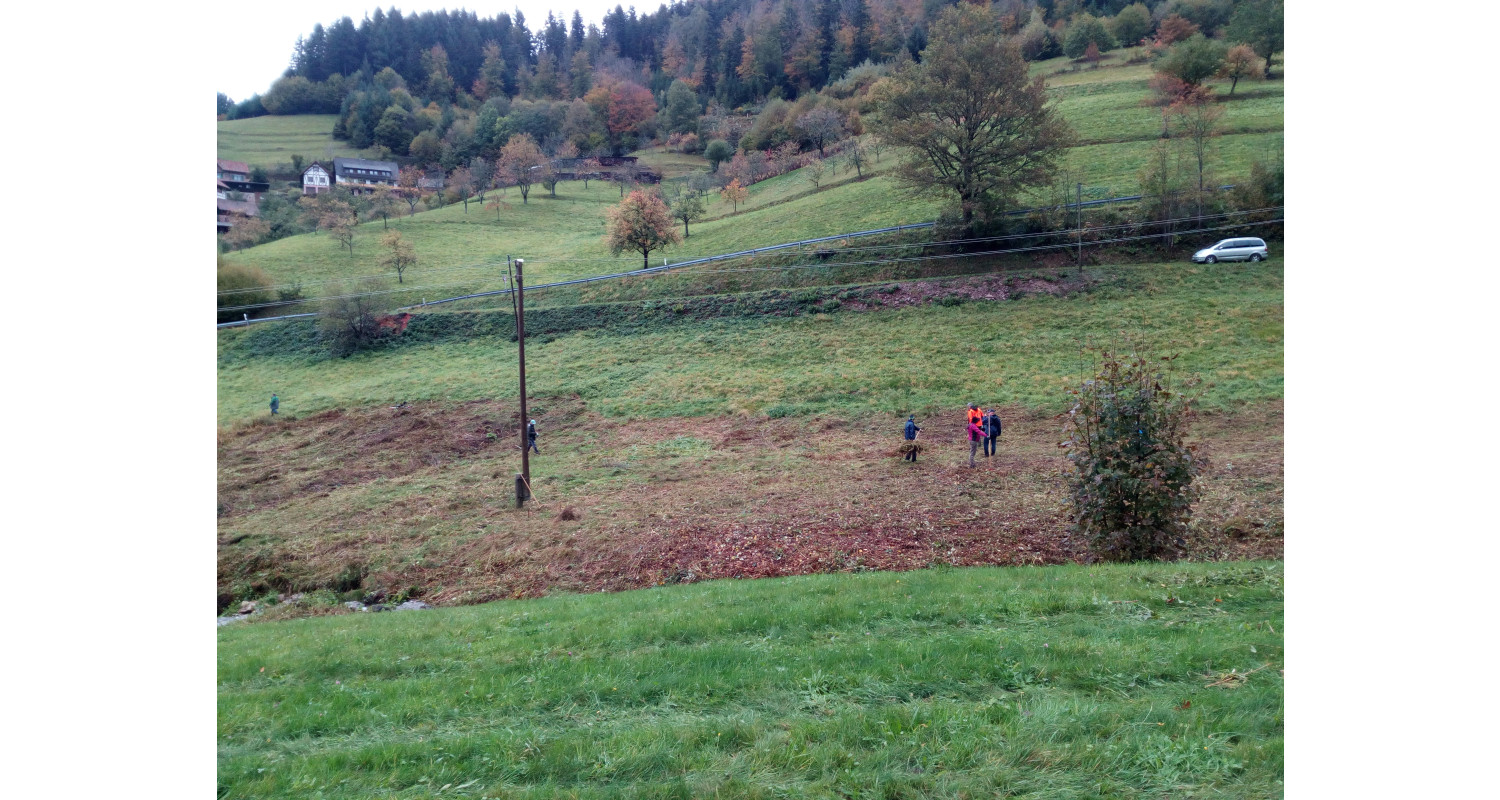 Erschwert wurde der Einsatz durch die regenreiche Witterung der Vortage: Teilweise sanken die Helfer wadentief im sumpfigen Gelände ein. Dennoch gelang es an dem Morgen, in Handarbeit die Fläche zu mähen und abzuräumen. Unterstützt wurde der Einsatz vom Naturpark Schwarzwald Mitte-Nord mit dem Förderprogramm HerzensSache Natur und seinen Sponsoren Mineralbrunnen Teinacher und Alpirsbacher Klosterbräu.
