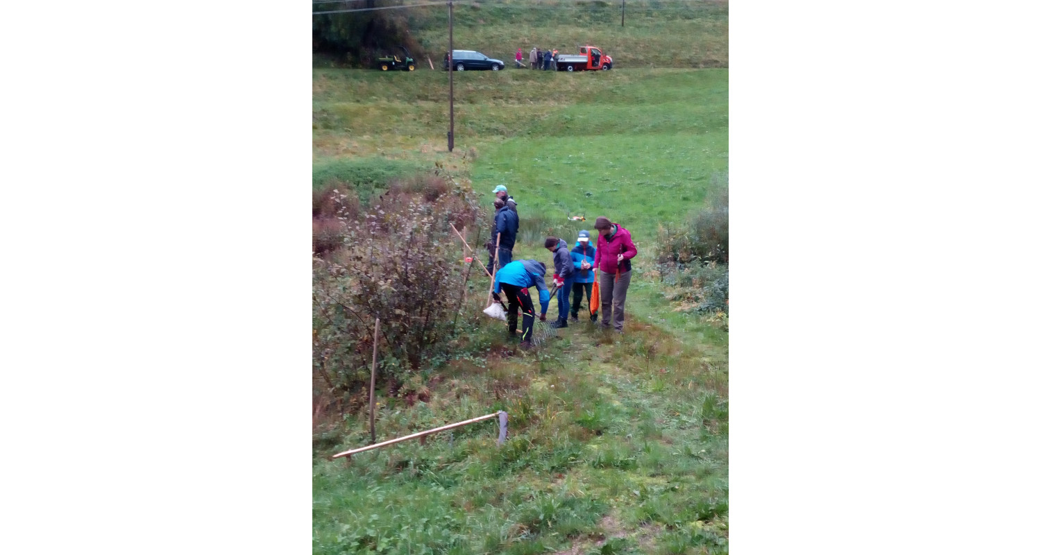 Erschwert wurde der Einsatz durch die regenreiche Witterung der Vortage: Teilweise sanken die Helfer wadentief im sumpfigen Gelände ein. Dennoch gelang es an dem Morgen, in Handarbeit die Fläche zu mähen und abzuräumen. Unterstützt wurde der Einsatz vom Naturpark Schwarzwald Mitte-Nord mit dem Förderprogramm HerzensSache Natur und seinen Sponsoren Mineralbrunnen Teinacher und Alpirsbacher Klosterbräu.