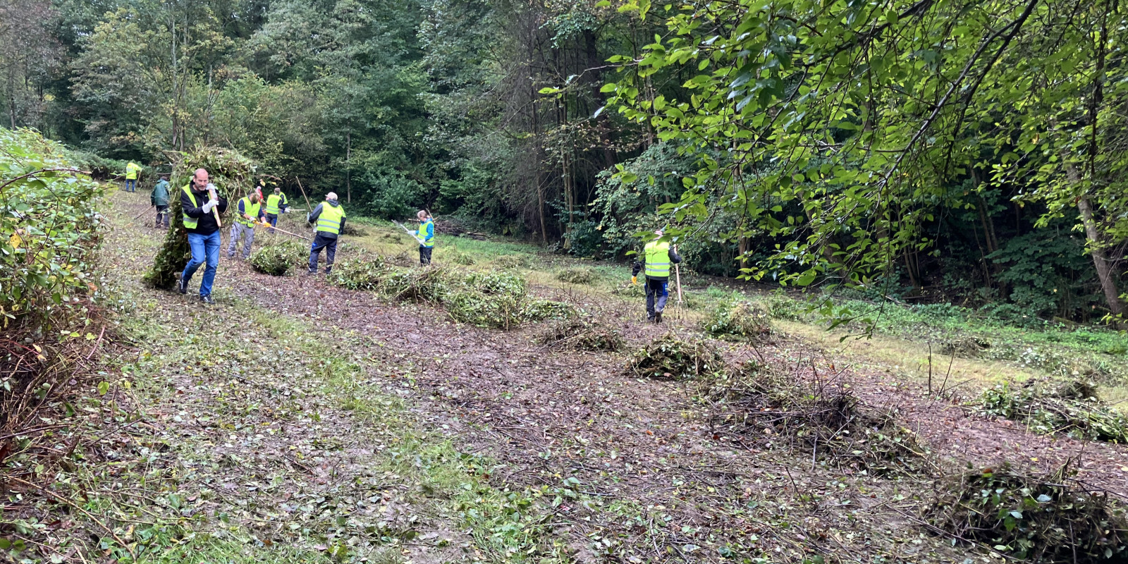 Das Team Biotoppflege und Naturschutz der Lebenshilfe Offenburg hatte im Vorfeld die der Brombeeren abgemäht. In dem schweren und zeitweise nassen Gelände ist der Maschineneinsatz jedoch nicht immer möglich. So war die Mithilfe der Actemium-Mitarbeiter sehr willkommen: Sie transportierten das Grüngut über die langgezogene, schmale Fläche händisch bis zum Waldparkplatz auf Halde. „Im nächsten Jahr werden Ziegen zum Einsatz kommen, um den Wildwuchs von Brombeeren, Springkraut und Sträuchern auf der städtischen Fläche gar nicht erst wieder entstehen zu lassen,“ erläuterte Friedmann die Planung.