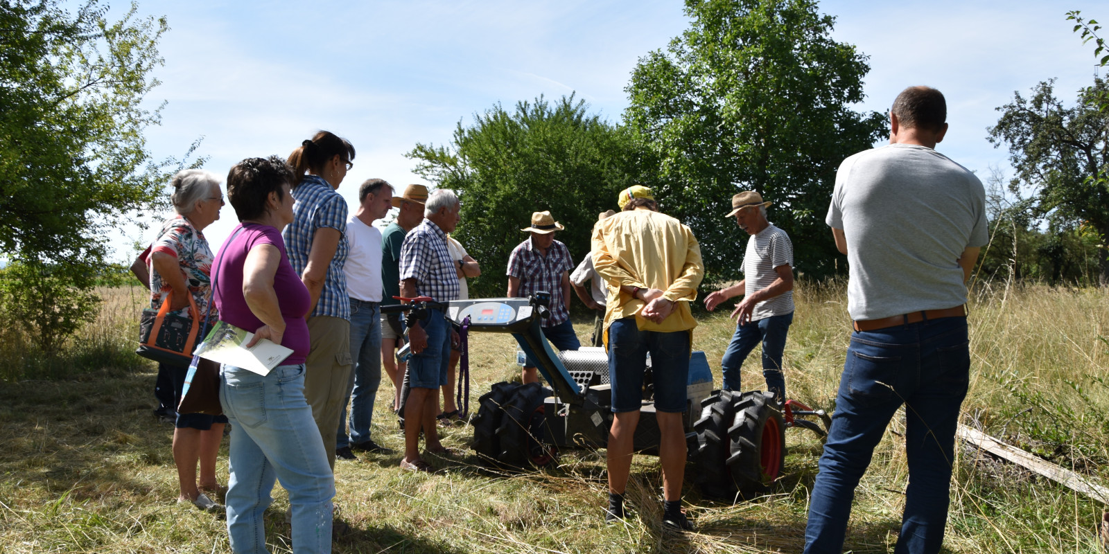 Anfang Juli trafen sich rund 20 Interessierte am Thema „Streuobstwiesenpflege und Artenvielfalt“ am südlichen Ortsrand von Nonnenweier. Der Teilnehmerkreis setzte sich bunt zusammen: Gemeinderäte und Verwaltungsvertreter der Gemeinde- und Kreisebene, die Eigentümer der Musterwiese, BLHV-Vertreter und Landwirte, aktive Nabu-Mitglieder, Jäger und Streuobstwiesenbesitzer. Dazu eingeladen hatte die Stadt Schwanau und der Landschaftserhaltungsverband Ortenaukreis (LEV). Wie Anika Brändlin vom LEV betonte, sei bei jedem Mäh- oder Mulchvorgang unter anderem der Insekten- und Käferbestand in großer Gefahr. Je nach angewandter Technik überleben diesen Eingriff nur etwa 10 % der dort lebenden Kleintiere. „Überhaupt nicht zu pflegen, ist aber auch keine Lösung, denn auch da verändert sich die Wiese nachteilig“, so Brändlin. Die Teilnehmerinnen und Teilnehmer, die auch aus Renchen und Lahr angereist waren, diskutierten angeregt über die fachlichen Angaben und ihre eigenen Erfahrungen. Dank der Unterstützung von vor Ort durch Klaus Bootz, Norbert Bühler, Bernhard Irion und Heinz Roth aus Neuried, konnten die Anwesenden nacheinander verschiedene Mähtechniken und die Auswirkungen live mitverfolgen: Handsense, Schlegelmulcher, Kreisel- und Balkenmäher. Die Gruppe kam zum Ergebnis, dass je nach Lage der Streuobstwiese und Ziel der Pflege, jeder für sich entscheiden müsse, welche Technik, welchen Mähzeitpunkt und Häufigkeit und welche unterstützenden Maßnahmen wie z.B. Altgrasbestände oder Totholzangebote für ihn in Frage kommen. Heinz Roth betonte ergänzend, dass nicht nur der Mähvorgang, sondern auch das Trocknen und Wegschaffen durchaus eine Rolle spiele für die Überlebenschance n in der Tierwelt. „Was die Pflege von Streuobstwiesen betrifft, ist ein Umdenken in der Gesellschaft notwendig und angestoßen“, fasste Anne-Marie Jarry, stellvertretende Geschäftsführerin vom LEV, zusammen. Sie stellte in Aussicht, dass in Zusammenarbeit mit Kristina Paleit von der Obst- und Gartenbauberatung im Landratsamt fachliche Informationen zusammengestellt werden.